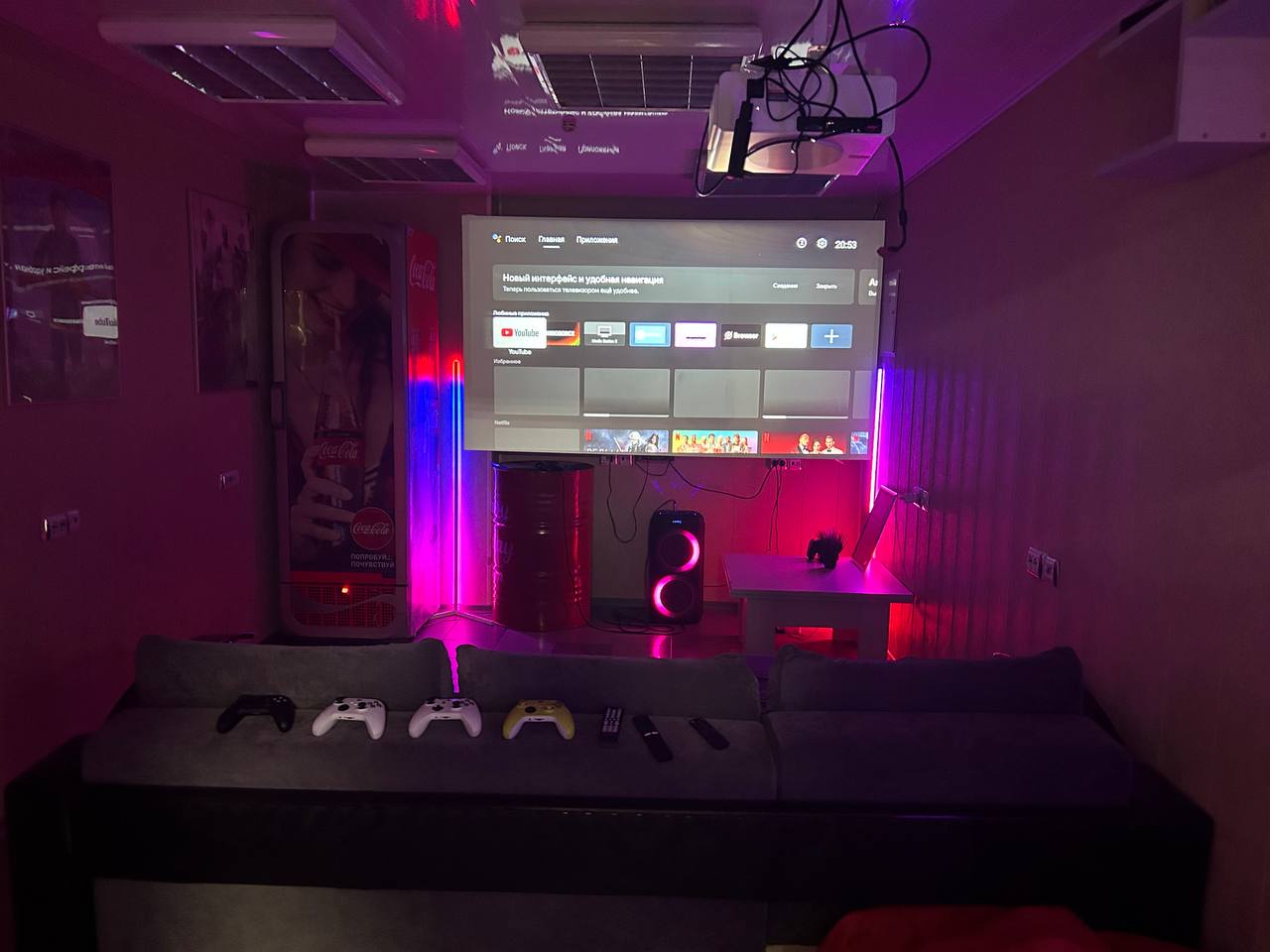 В уютной VIP-комнате, вы сможете наслаждаться просмотром любимых фильмов на огромном экране в приятной атмосфере. У нас вы найдете большую библиотеку киношедевров, которые можно выбрать для просмотра в любое время. Расслабьтесь на мягком, удобном диване и погрузитесь в мир кино, наслаждаясь чистым звуком и яркой картинкой. Мы уделили внимание каждой детали для того, чтобы вы смогли по-настоящему расслабиться и отдохнуть в #ИГРОХАТЕ.